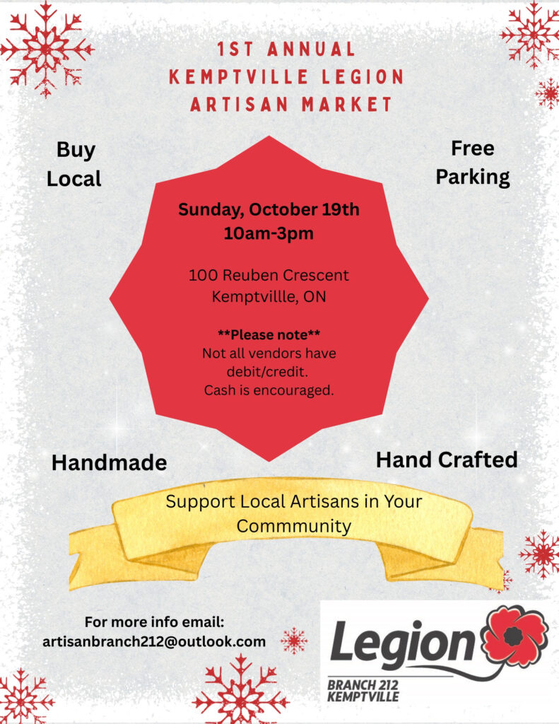 Don’t miss the 1st Annual Kemptville Legion Artisan Market Support local makers, find unique gifts, and enjoy a great community vibe.